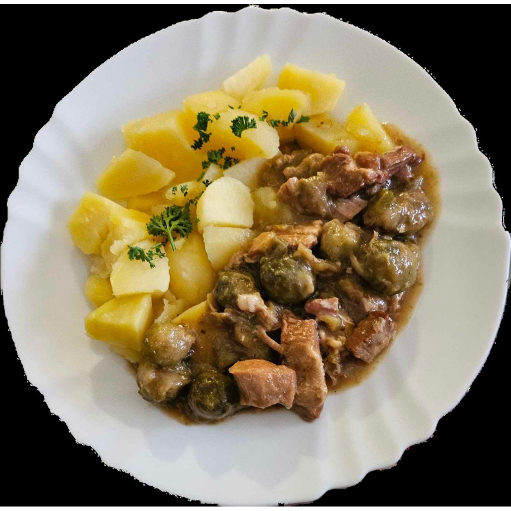 180/250g 08. Hovězí kostky v kapustě, vařené brambory