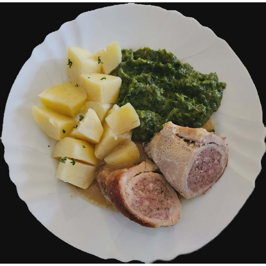 180/250g Zbojnický vepřový závitek, špenát, brambory / bramborový knedlík