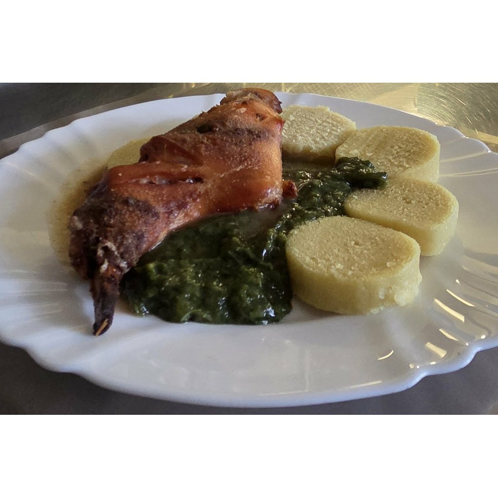 250/250 g Pečené králičí stehno, dušený špenát, bramborový knedlík / brambory