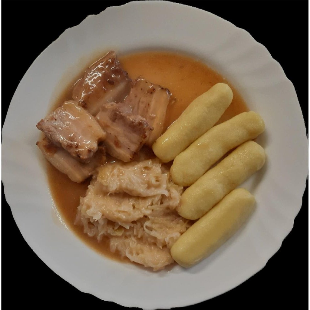 180/250g Pečený bůček na česneku, dušené zelí, bramborové špalíky
